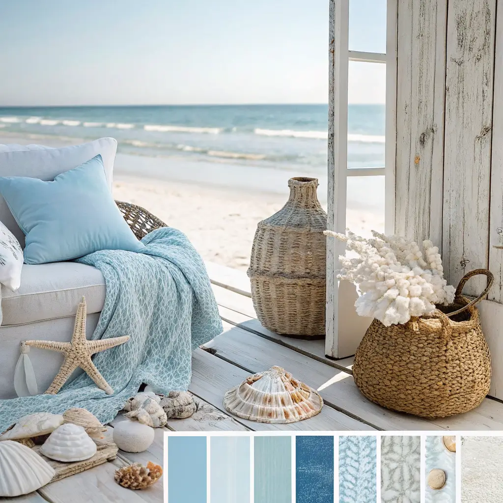 Natural textures reinforce the coastal vibe. Weathered wood, woven seagrass, linen, sisal – materials that could survive salt air even if they never encounter it. Include these actual textures on your board to feel how they complement each other.