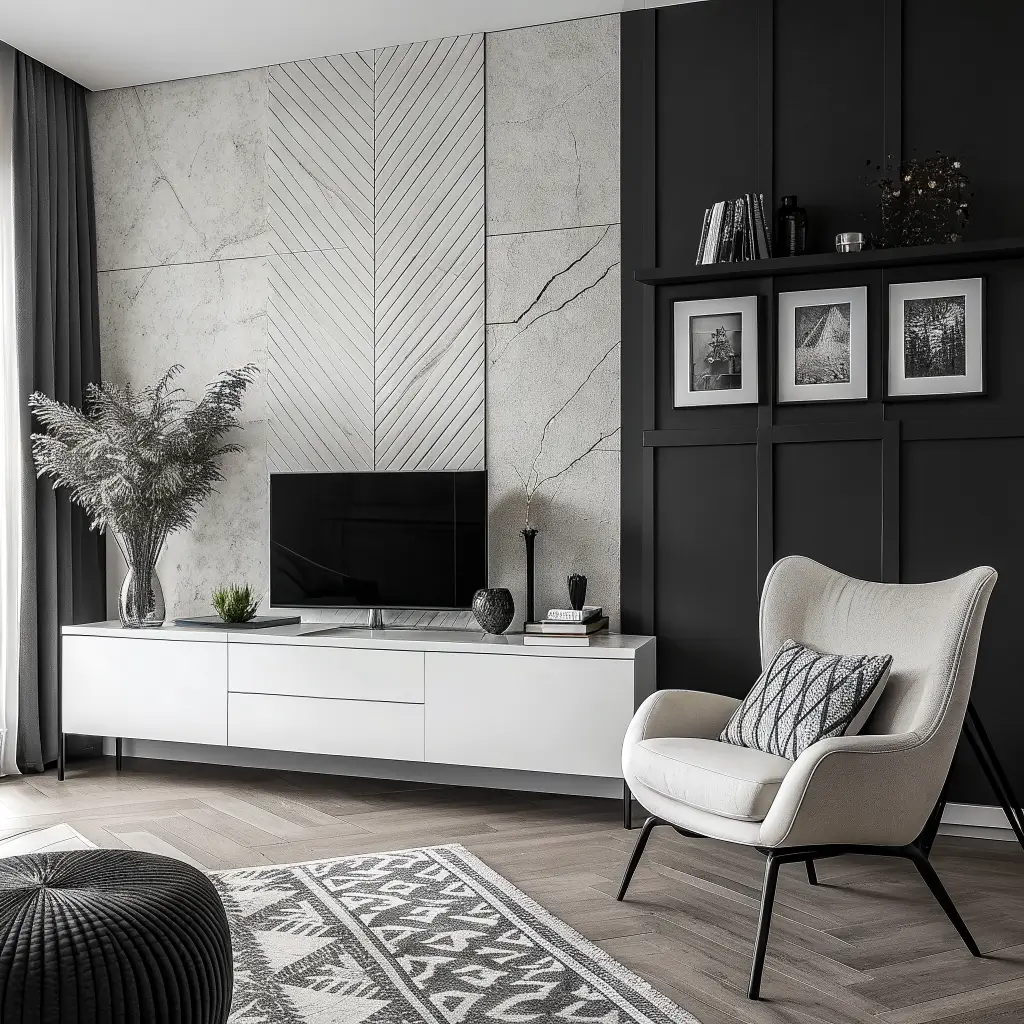 The value range provides all the interest. Pure black to pure white with every gray between creates stunning depth when used thoughtfully. Your mood board should show exactly where each element falls on this spectrum and how they’ll interact spatially.
