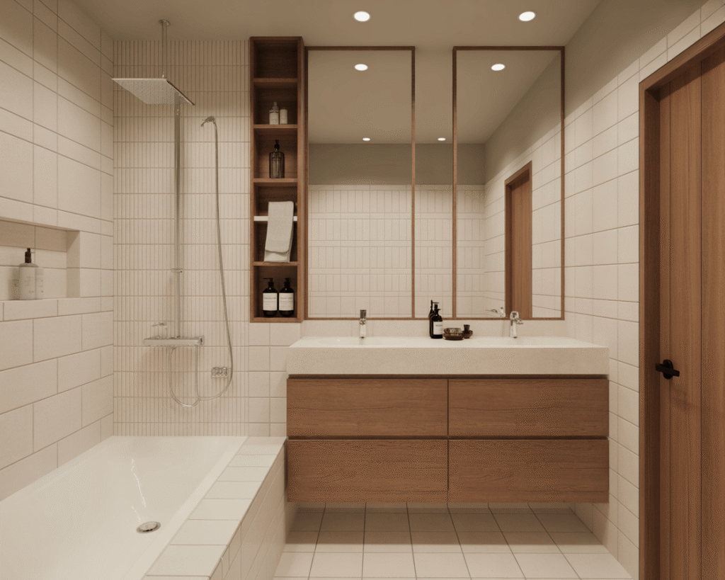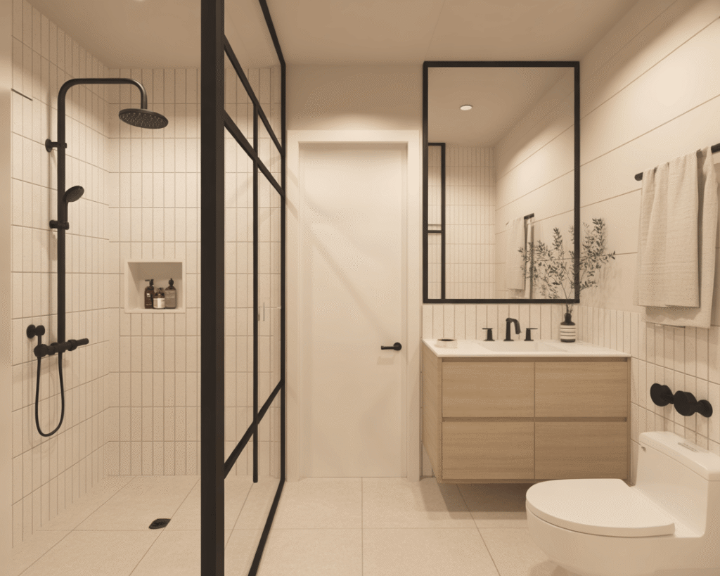 Here’s where things get interesting. While Japandi leans heavily on natural woods and whites, strategic black elements ground the space beautifully. I’m talking about matte black faucets, shower frames, or mirror edges.