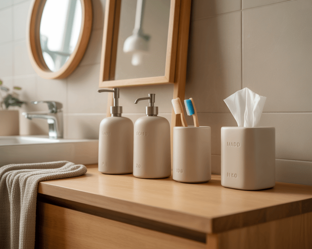 Every item in a Japandi bathroom should be both beautiful and functional. Choose accessories that serve a purpose while contributing to the aesthetic. My soap dispenser, toothbrush holder, and tissue box are all matching matte ceramic pieces – simple, functional, beautiful.