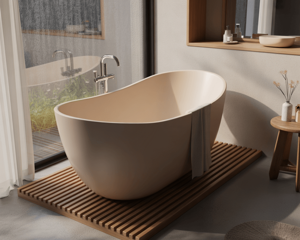 Mine sits on a platform of natural wood slats, creating this gorgeous contrast between smooth curves and linear elements. Pro tip: Position your tub near a window if possible. There’s something magical about soaking while watching the rain or snow fall 🙂