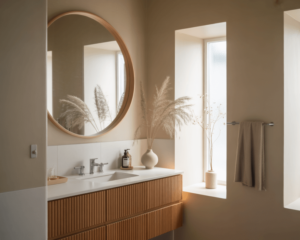 Mirrors in Japandi bathrooms should feel like windows, not decoration. Round mirrors soften angular spaces, while rectangular ones emphasize clean lines. I chose a circular mirror with a thin wooden frame, and it perfectly balances my linear vanity.