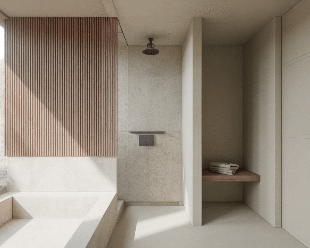 - Vertical wood slats – instant spa vibes