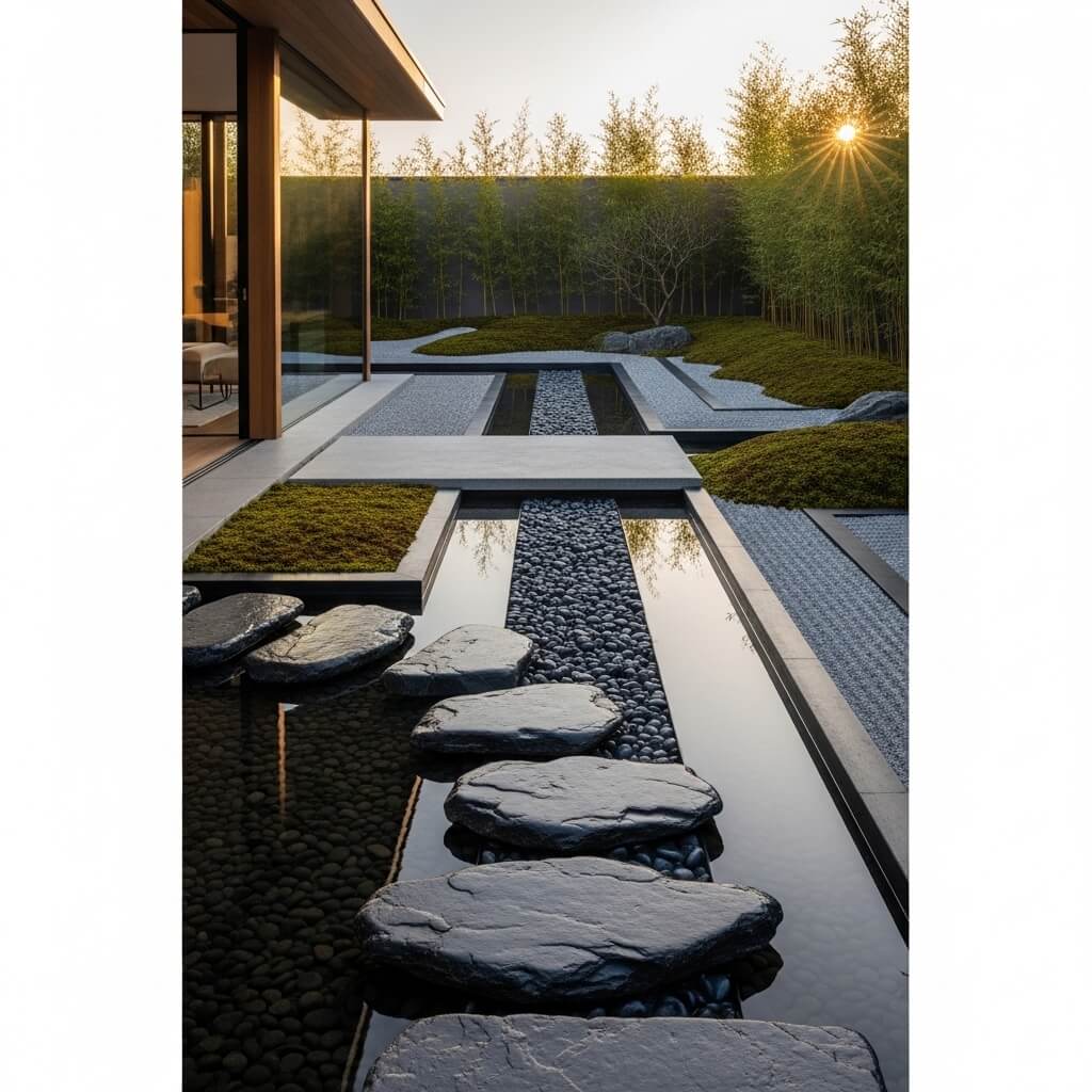 Modern Japanese Garden with Water Stone Pathway