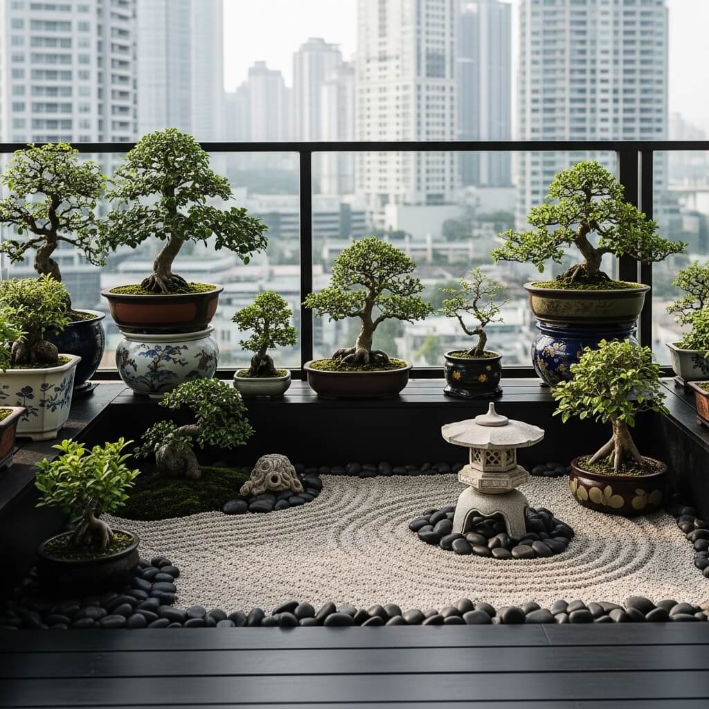 Balcony Japanese Garden with Mini Bonsai Arrangement