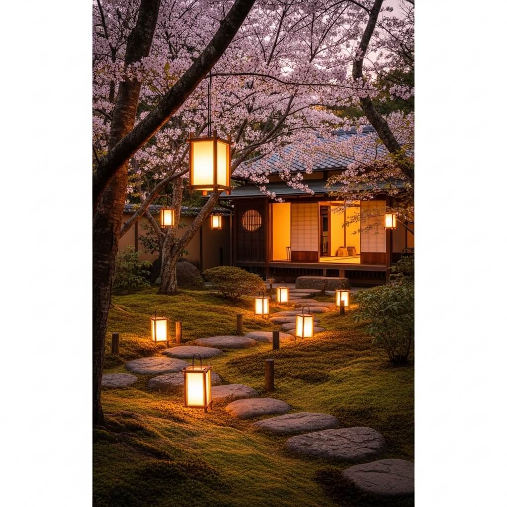 Traditional Tea Garden with Wooden Lantern Lighting
