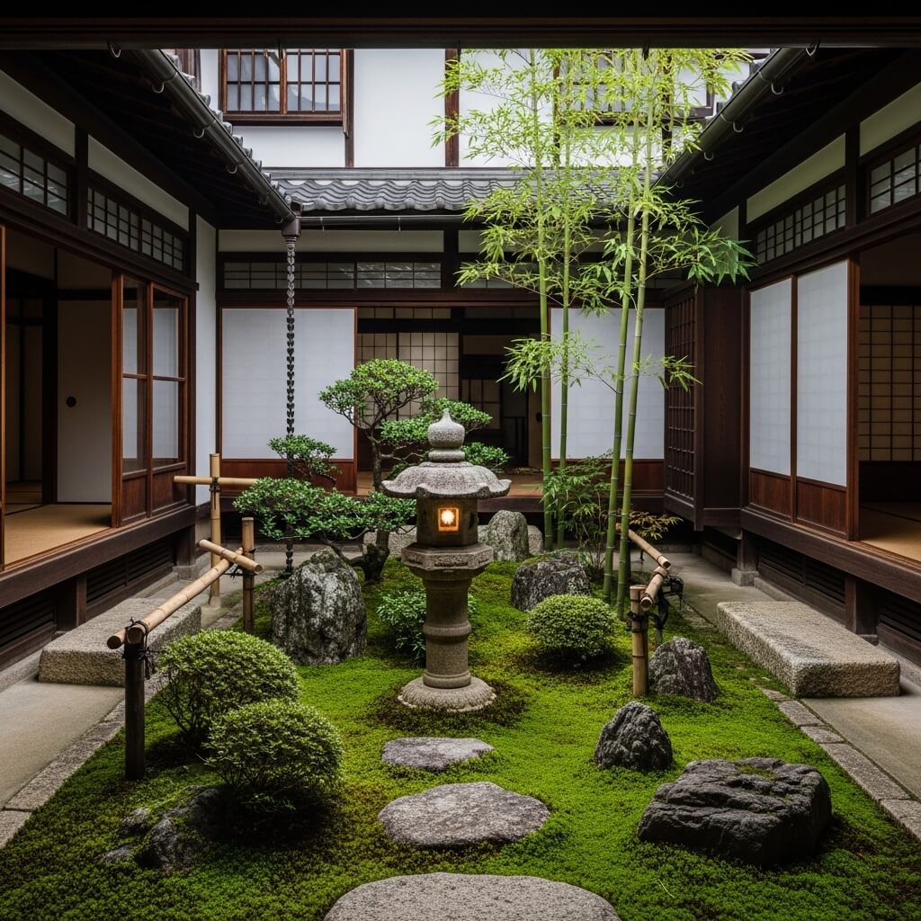 Japanese Courtyard Garden with Stone Lantern Centerpiece