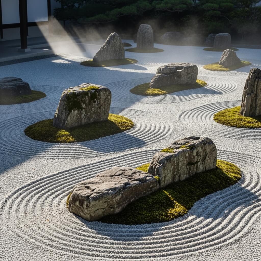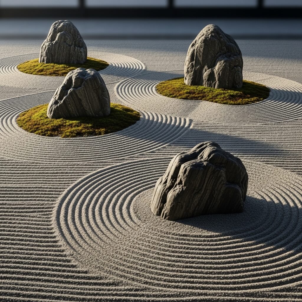 A Zen rock garden, or karesansui if you want to get fancy, strips everything down to the essentials. We’re talking carefully placed rocks emerging from meticulously raked gravel patterns that represent water flowing around islands. No plants, no water features—just you, some rocks, and a whole lot of minimalist beauty.