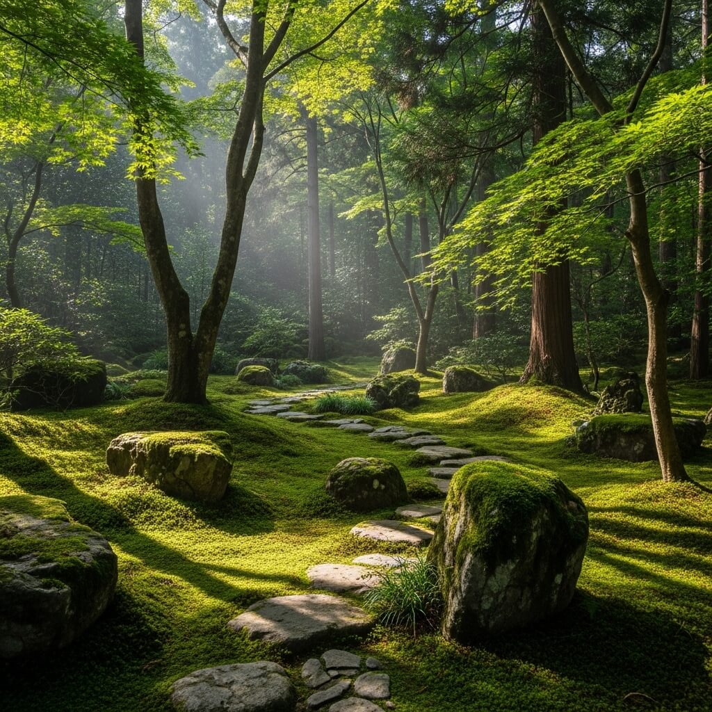 Forest-Style Japanese Garden with Moss and Stones