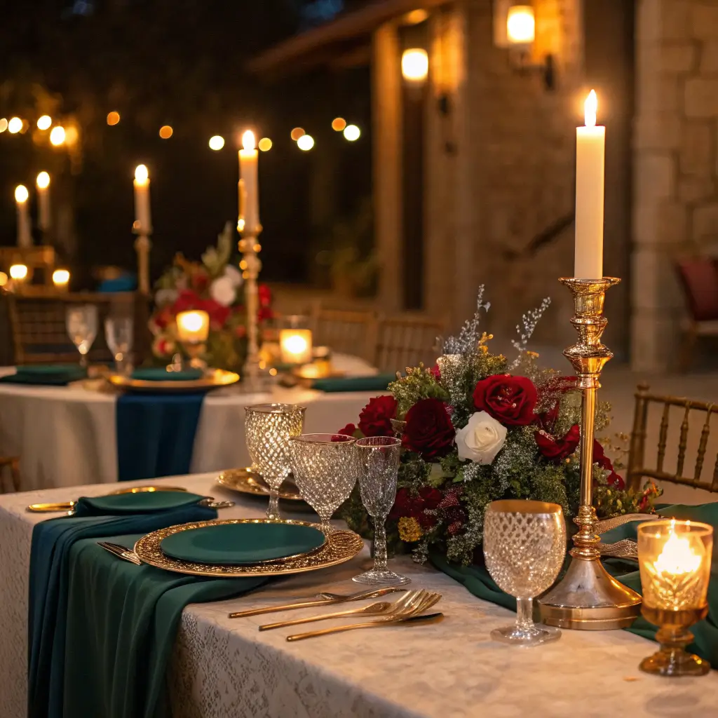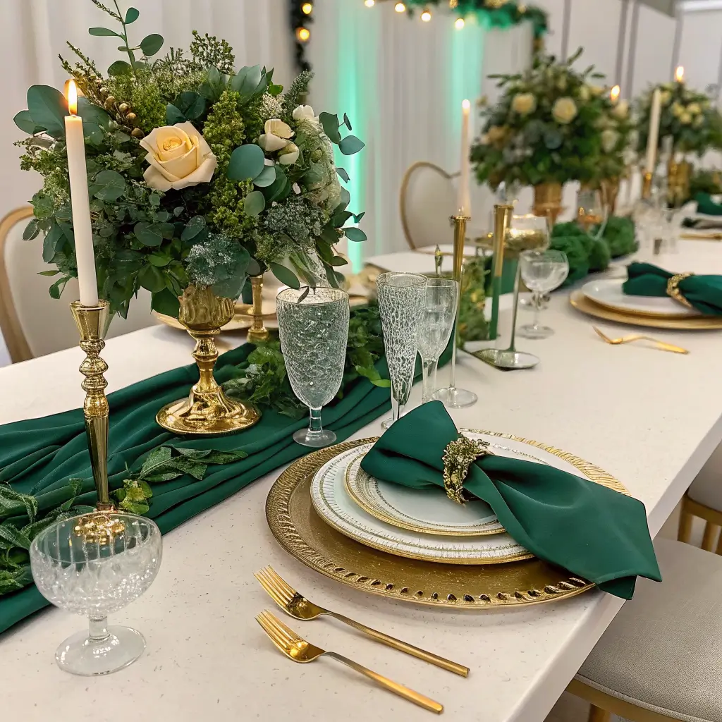 For centerpieces, mix emerald glass votives with gold candlesticks of varying heights. The flickering candlelight creates this gorgeous interplay between the green and gold that’s pure magic. Pro tip: throw in some eucalyptus garland for texture – it’s budget-friendly and adds that organic element that keeps everything from looking too formal.