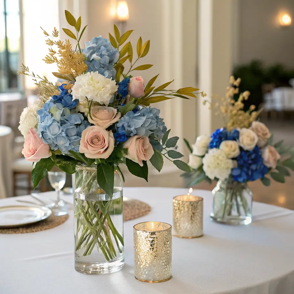 Here’s where it gets fun: incorporate actual blue elements beyond just flowers. Think navy blue glass vases, sapphire-colored table runners, or even blue-tinted water in clear vases (yes, that’s a thing, and yes, it looks incredible). I’ve seen couples use blue LED lights under clear vases to create this ethereal glow that makes the whole centerpiece look like it’s lit from within.