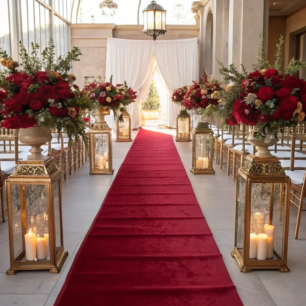 Line the aisle with deep red rose petals scattered along the edges, and add tall arrangements of burgundy and deep red flowers at key points. Think dramatic, think bold, think “this is my moment and I’m owning it.” The contrast between the rich red and whatever your venue’s natural colors are will create this stunning visual that your guests will remember forever.