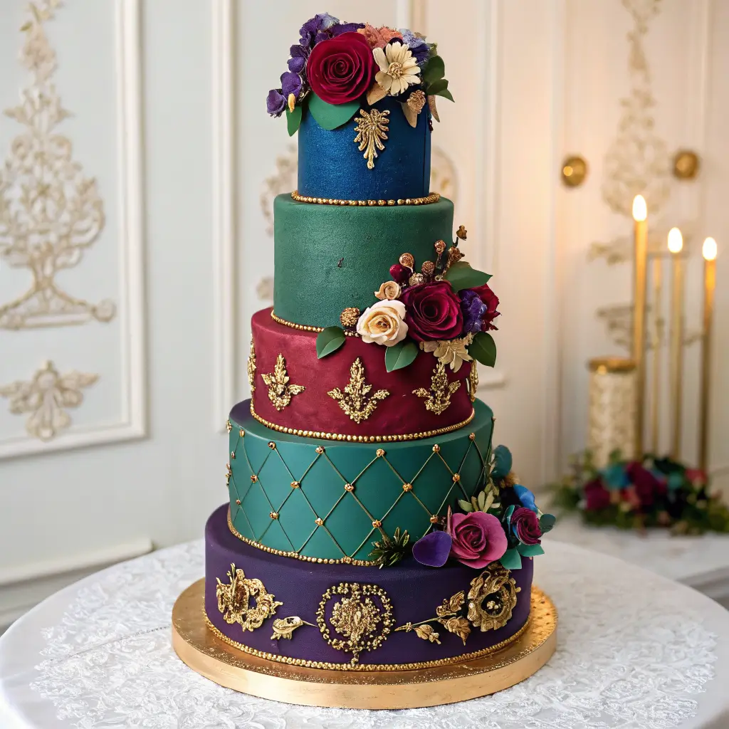 jewel-tone layered cake can go several directions. You could do different colored layers – maybe emerald green, sapphire blue, and amethyst purple. Or stick with one main jewel tone and add metallic accents like gold leaf, silver pearls, or edible glitter that catches the light.