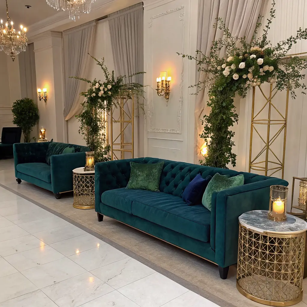 Creating a lounge area at your reception is such a smart move, especially when you make it as gorgeous as a midnight blue and emerald setup. It gives your guests a place to relax, chat, and take a break from dancing, all while staying within your stunning color scheme.