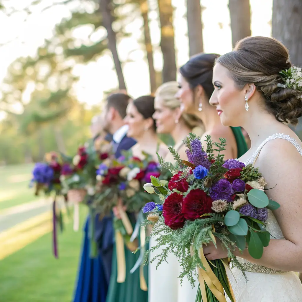 Here’s where you can really let your creativity shine – mixed jewel tone bridesmaid bouquets that complement each other without being identical. This approach gives each of your bridesmaids a unique bouquet while maintaining a cohesive overall look.