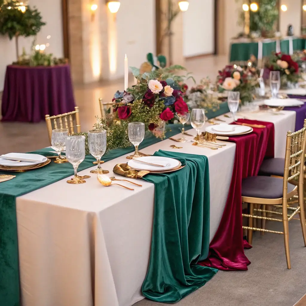 Don’t be afraid to mix patterns and textures either. A sequined emerald runner paired with matte gold chargers, or a silk sapphire runner with textured glassware. The contrast between different textures adds visual interest and keeps your tables from looking flat or one-dimensional.