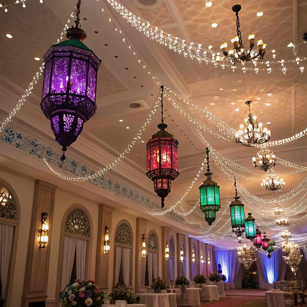 Mix different sizes and colors of hanging lanterns throughout your reception space. Deep purple paper lanterns mixed with emerald green glass ones, maybe some ruby red fabric lanterns thrown in for good measure. Hang them at varying heights to create visual interest and depth.