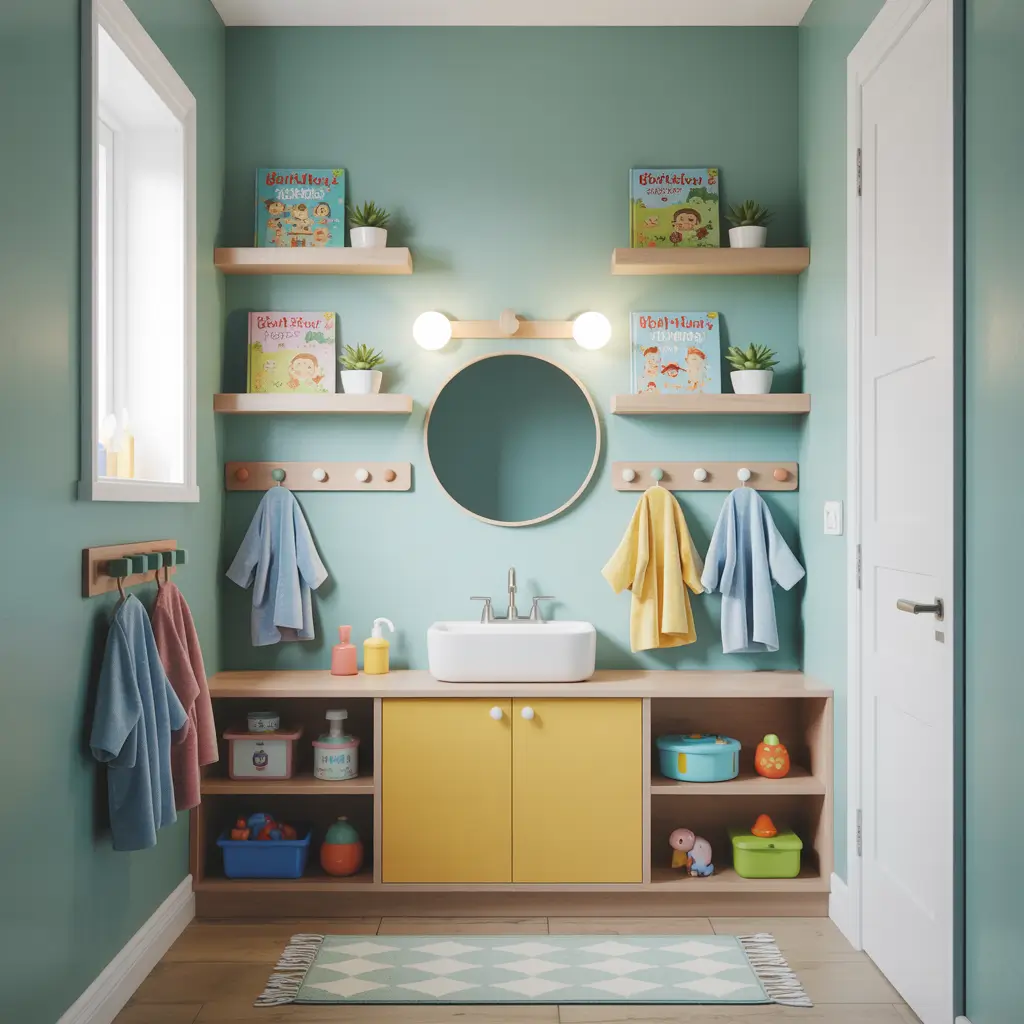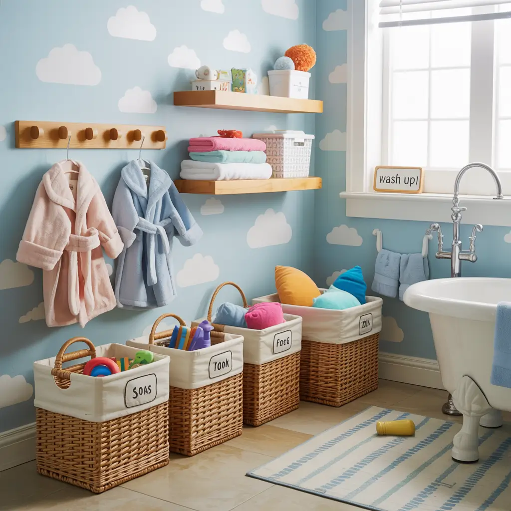 Wall-mounted everything is your friend here. Hooks for towels (easier than towel bars for kids), magnetic strips for hair accessories, and mesh bags for bath toys that actually drain properly. Your floor space stays clear, and everything has a home.