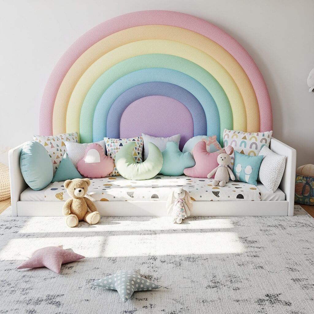 Rainbow headboards typically feature a series of curved fabric panels arranged in classic ROYGBIV color order (or a pastel version for a softer look). The arch shape not only mimics a rainbow but creates a protective, cave-like feeling that kids find comforting.