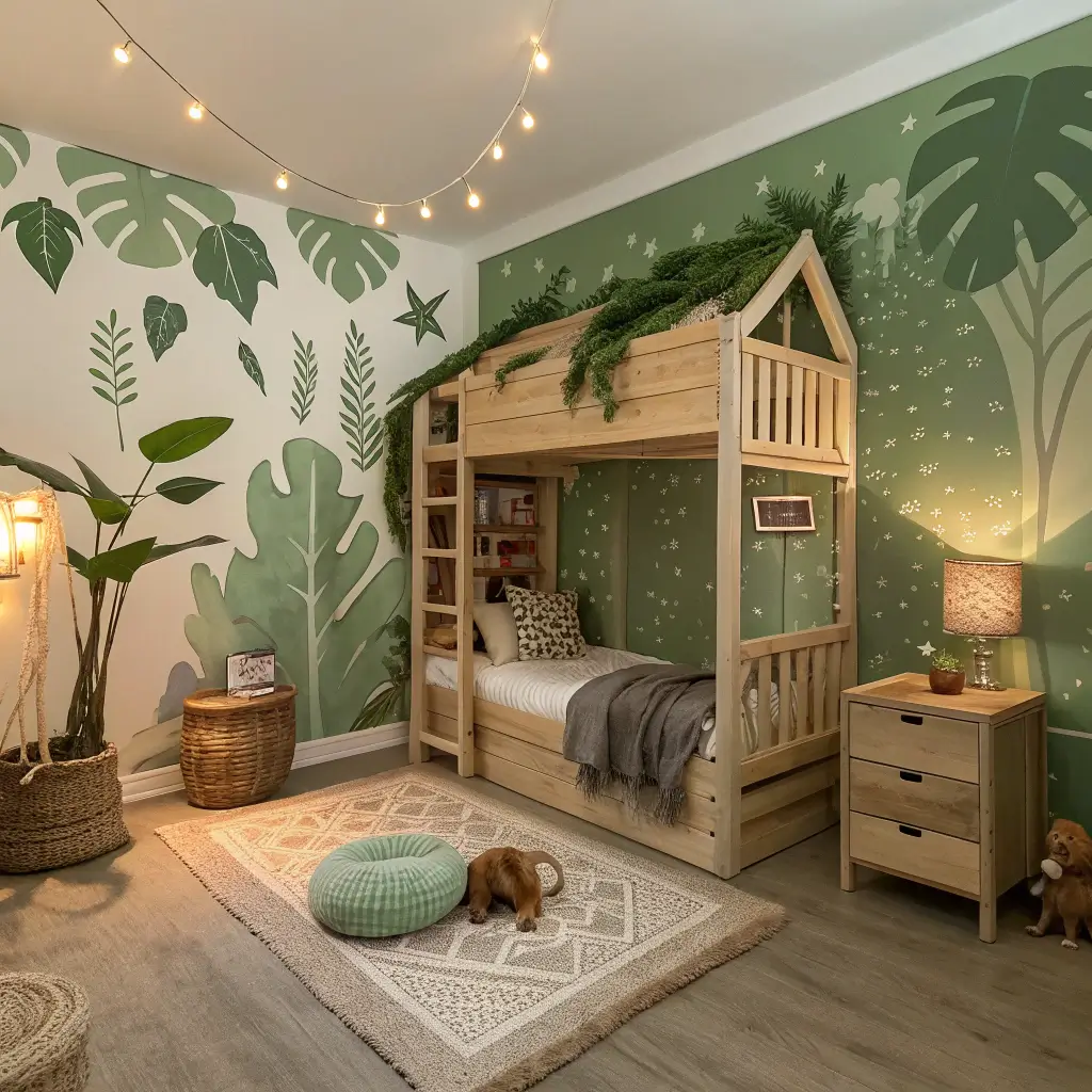 Nature themes work brilliantly for boys who collect rocks, bugs, and mysterious outdoor “treasures.” Modern nature rooms feel like junior naturalist headquarters rather than cartoon jungles.
