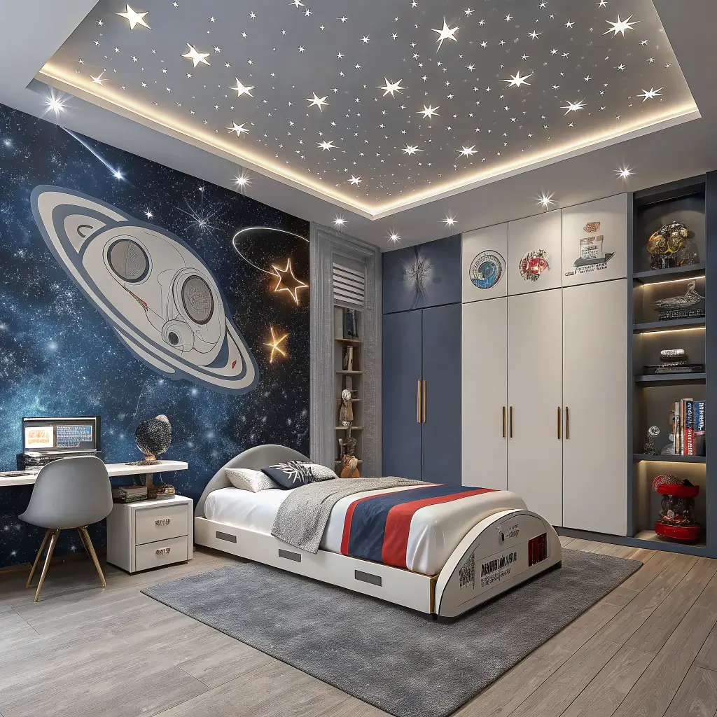 We transformed my nephew’s room with metallic silver furniture, LED strip lighting he controls with his phone, and a projector that displays actual constellation patterns. The ceiling has accurate star maps, and his desk looks like a control panel. Total cost was reasonable, but it looks like we hired Hollywood set designers.