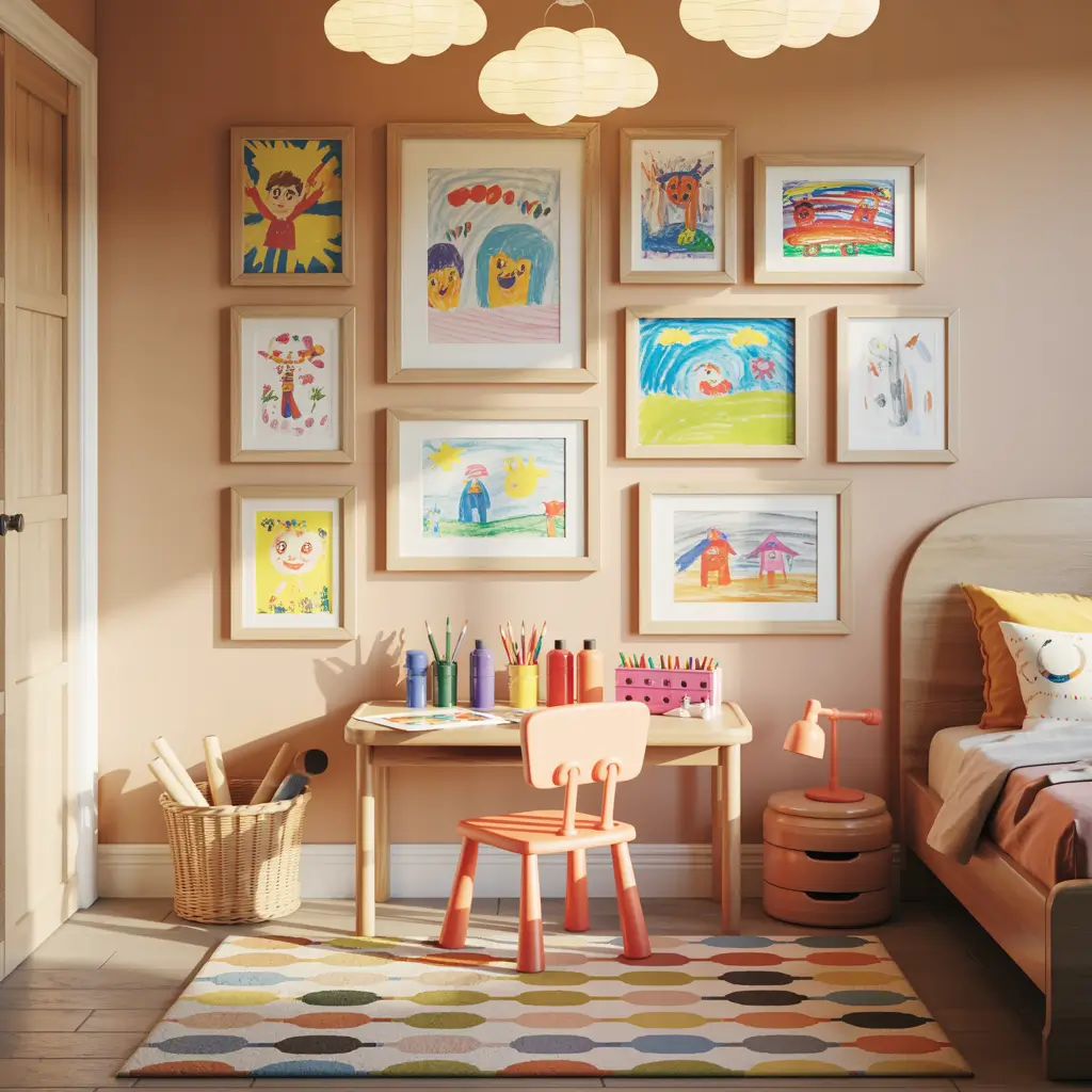 What makes this approach brilliant? Your kid’s artwork becomes the star of the show. Those finger paintings suddenly look like modern art against a calm backdrop.