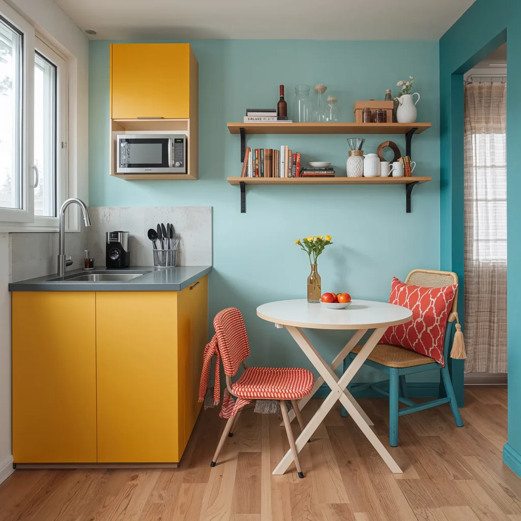 Ever considered a fold-down wall table? Game changer. When you’re not eating, it disappears flat against the wall. Need more seats? Stackable stools slide under counters like magic.