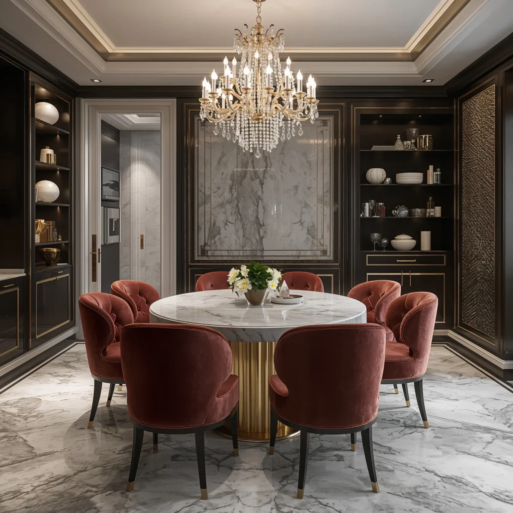 Think marble countertops (or convincing quartz alternatives), crystal glassware displayed in glass-front cabinets, and dining chairs upholstered in sumptuous fabrics. It’s about quality materials and attention to detail.