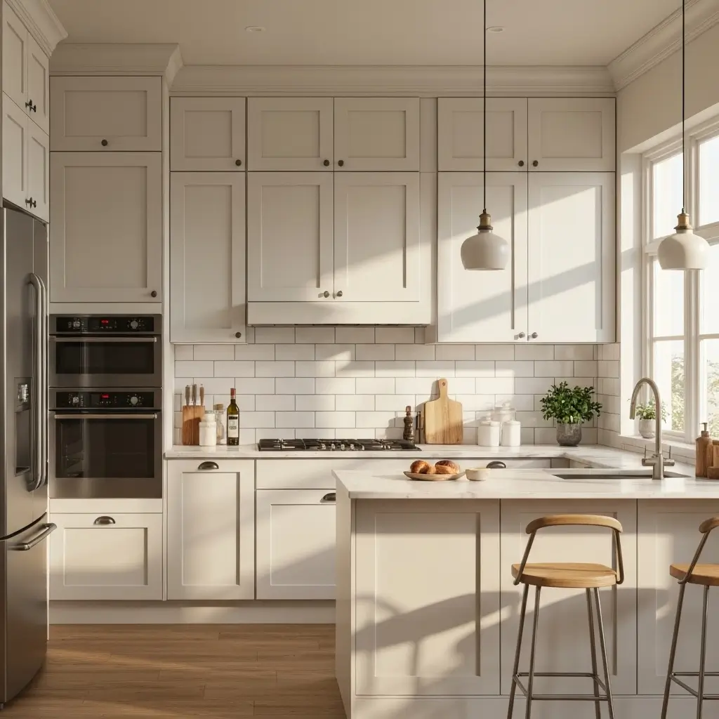 The beauty of neutrals lies in their versatility. Change your accessories, and your kitchen gets a whole new personality. Gray subway tiles look industrial with black hardware but feel soft with brass fixtures. Beige natural stone brings warmth that prevents white cabinets from feeling cold.