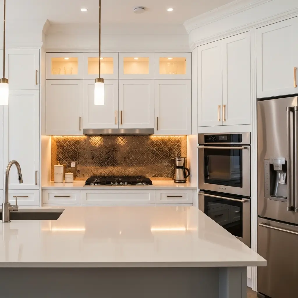 Metallic backsplashes with white cabinets bring the bling without the commitment of full-on glam. Copper, brass, gold, or stainless steel tiles add warmth and sophistication that plays beautifully against crisp white cabinetry. These materials reflect light, making your kitchen feel brighter and more spacious.