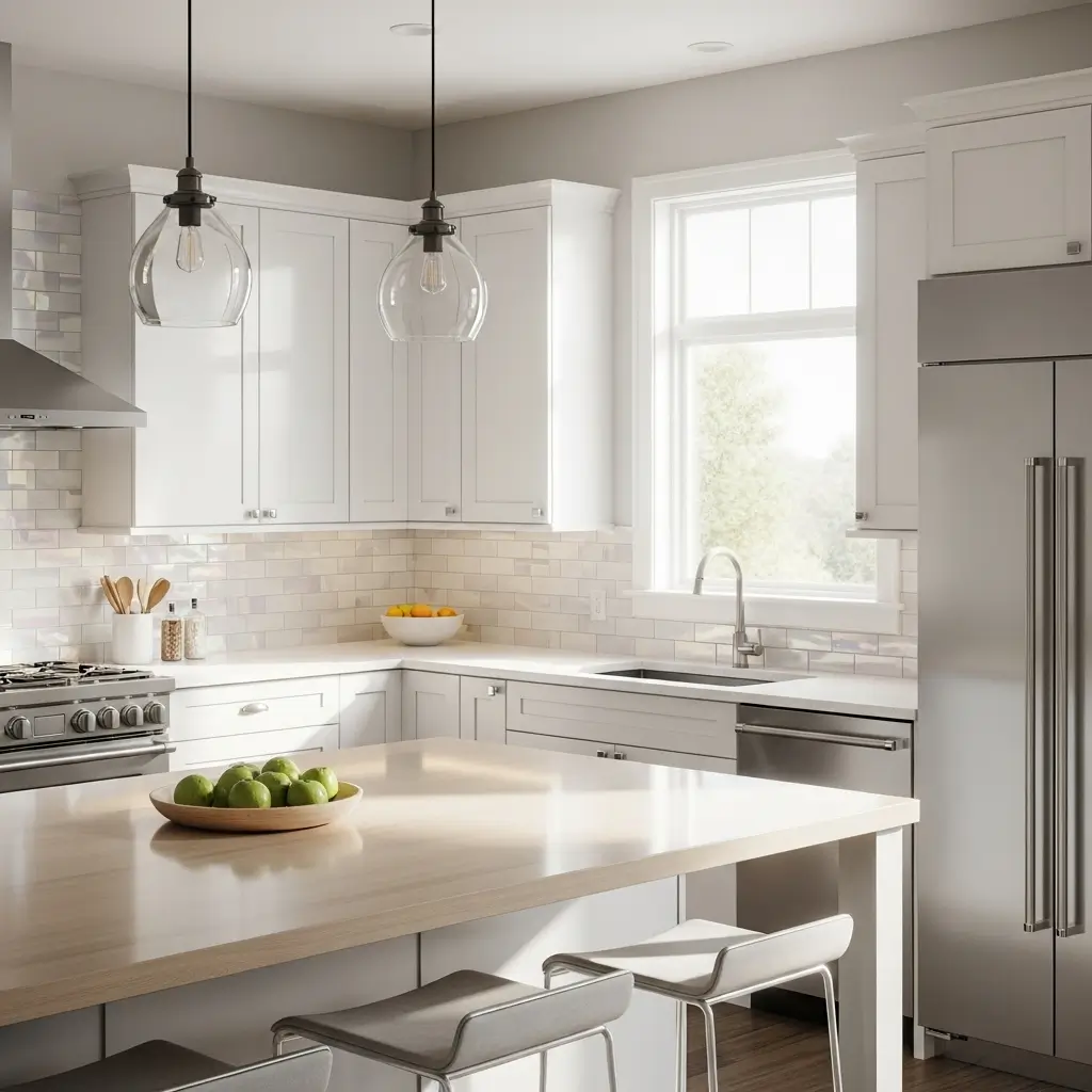 Glass tiles bring luminosity and depth that other materials can’t match. They reflect light beautifully, making your white cabinets appear even brighter and your whole kitchen feel more open. From clear glass to colored options, the possibilities are endless.