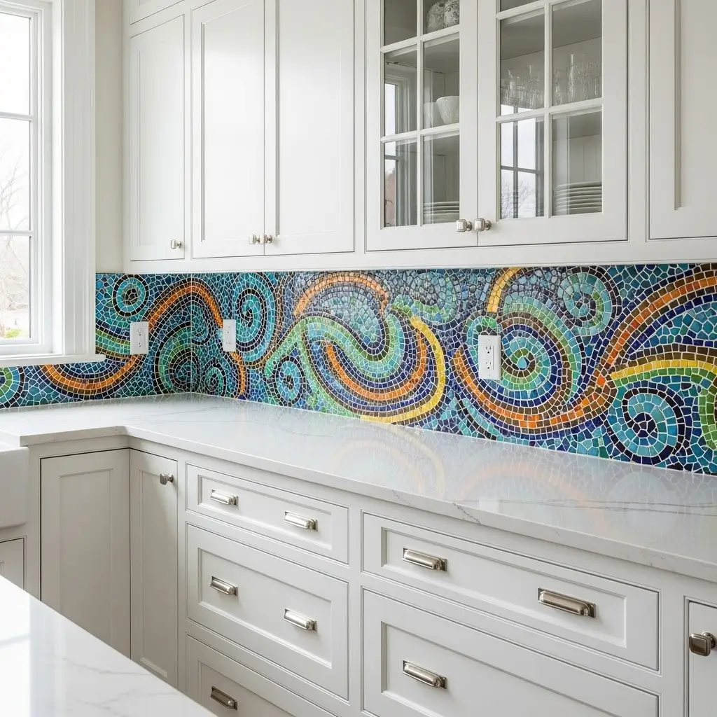 Mosaic tiles turn your backsplash into functional art. Whether you choose traditional patterns or modern designs, these intricate tiles add personality that makes your kitchen uniquely yours. White cabinets provide the perfect neutral backdrop for these detailed designs.
