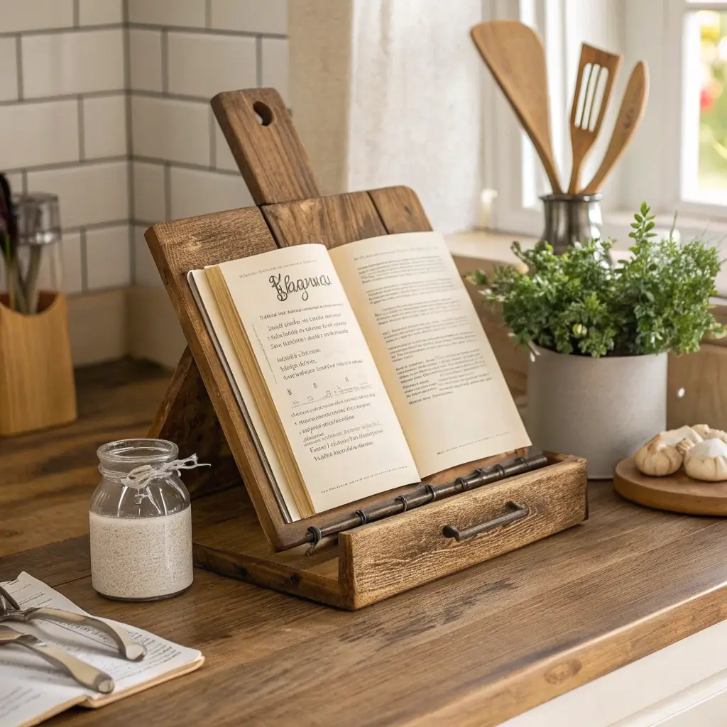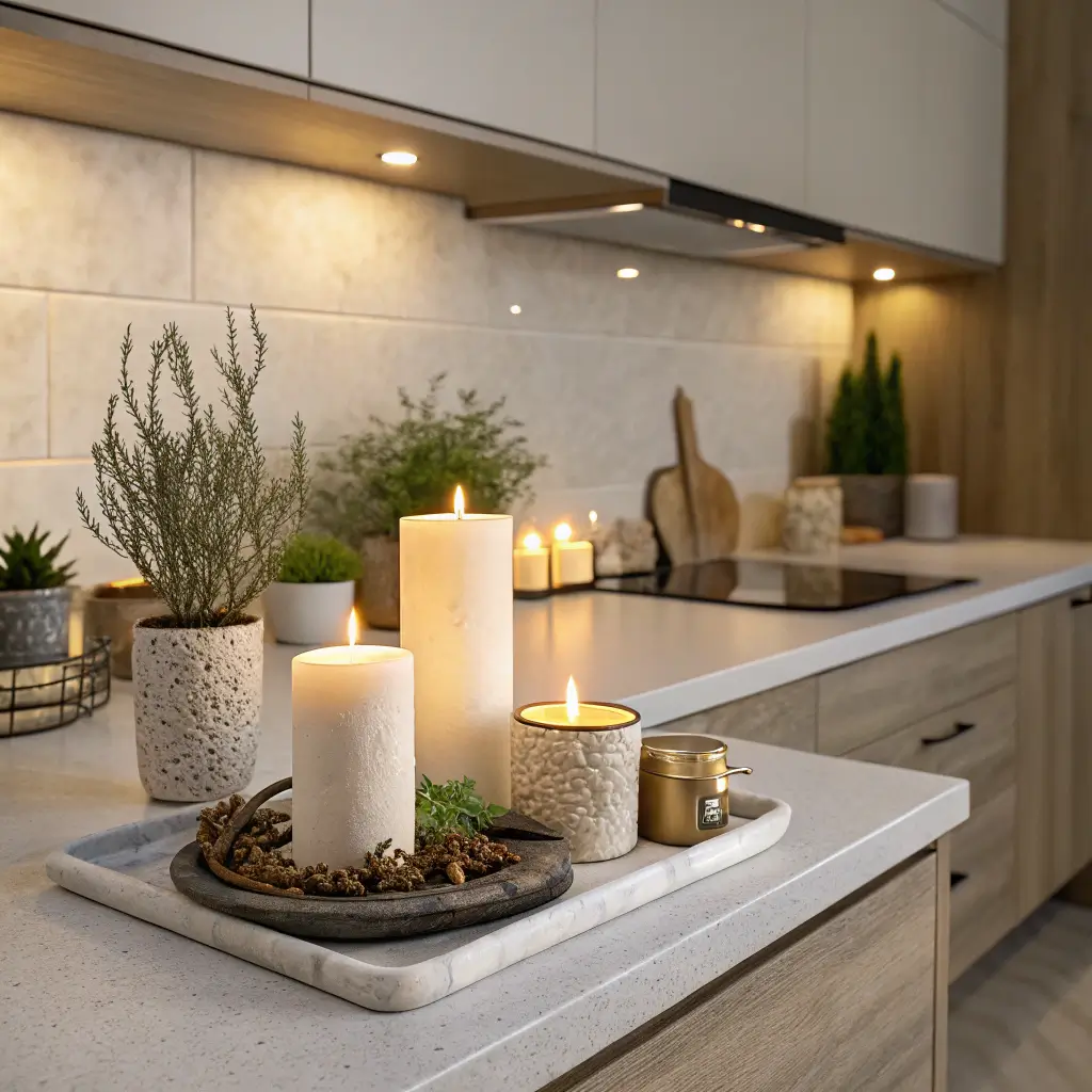 The tray itself becomes decor while organizing smaller items into a cohesive vignette. Choose wood that complements your kitchen’s existing tones.
