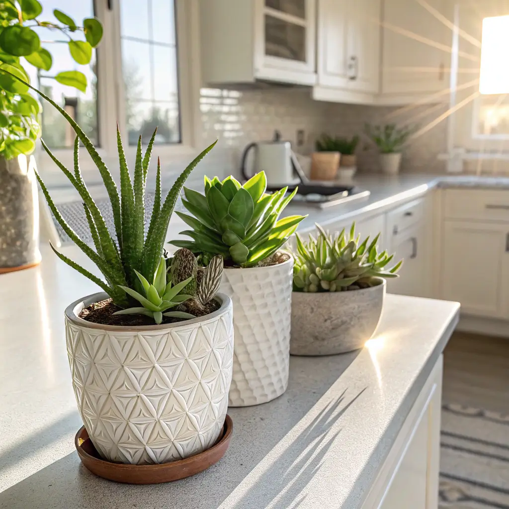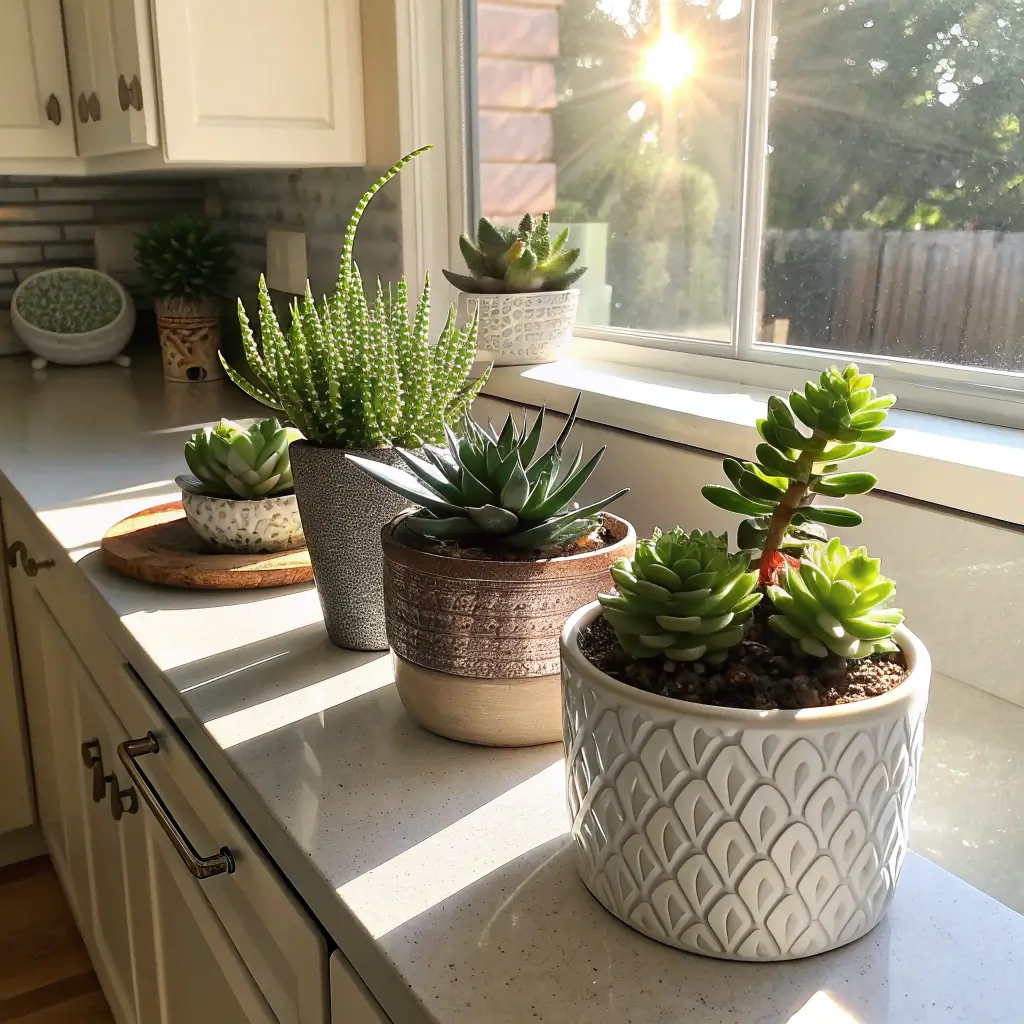 My succulent corner features five small plants in white ceramic pots. I water them maybe once every two weeks, and they’re thriving. That low-maintenance requirement means they actually survive instead of becoming brown corner sadness.