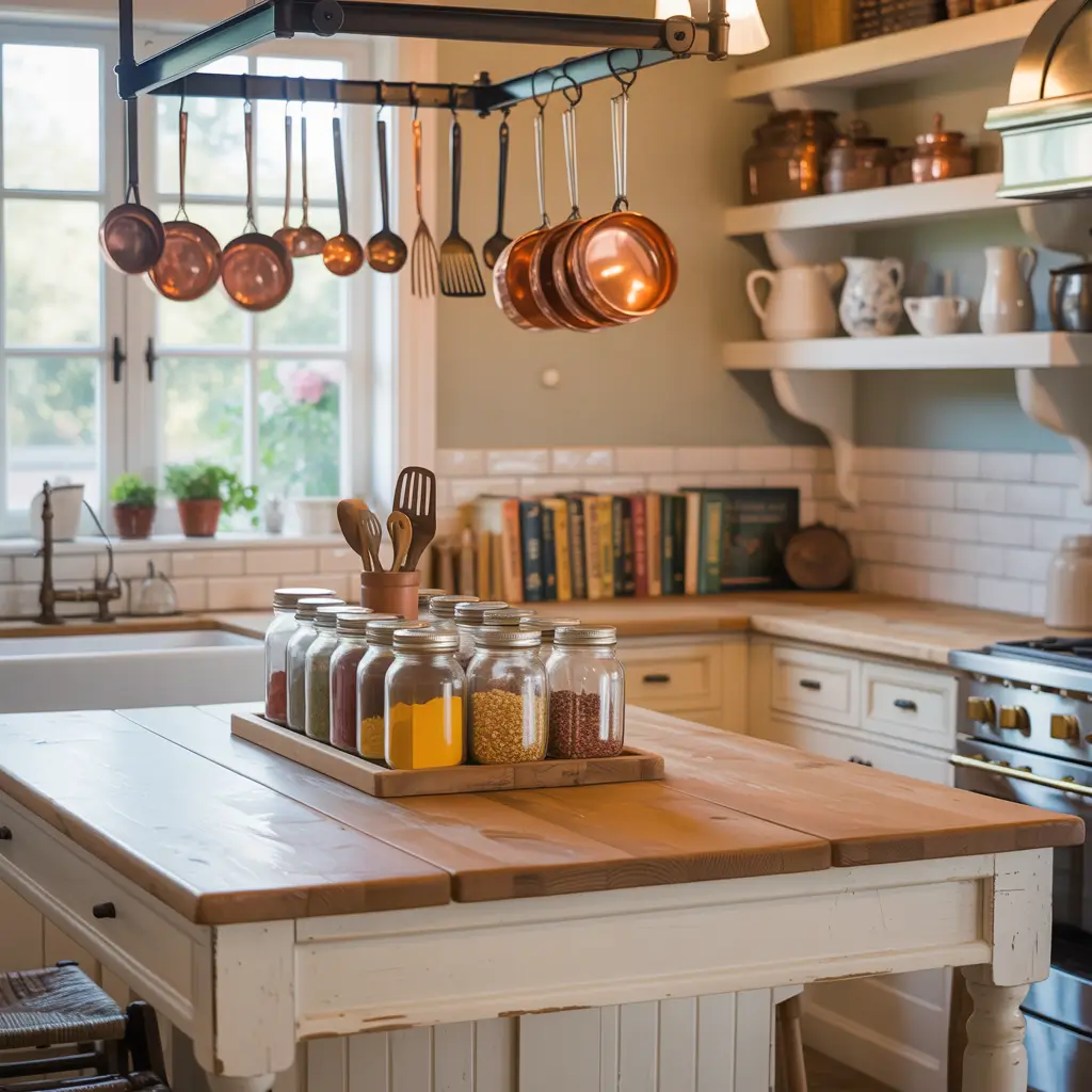 Add metallic accents sparingly. A copper pot or brass utensils can add warmth, but too much metal-on-metal gets busy. I limit myself to one or two metallic pieces per shelf.