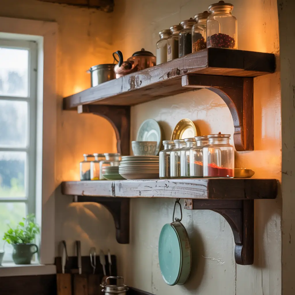 Mix practical and decorative items. My rustic shelves hold everyday dishes on lower shelves and decorative pieces like vintage scales and mason jars up top. The combination feels intentional rather than just utilitarian.