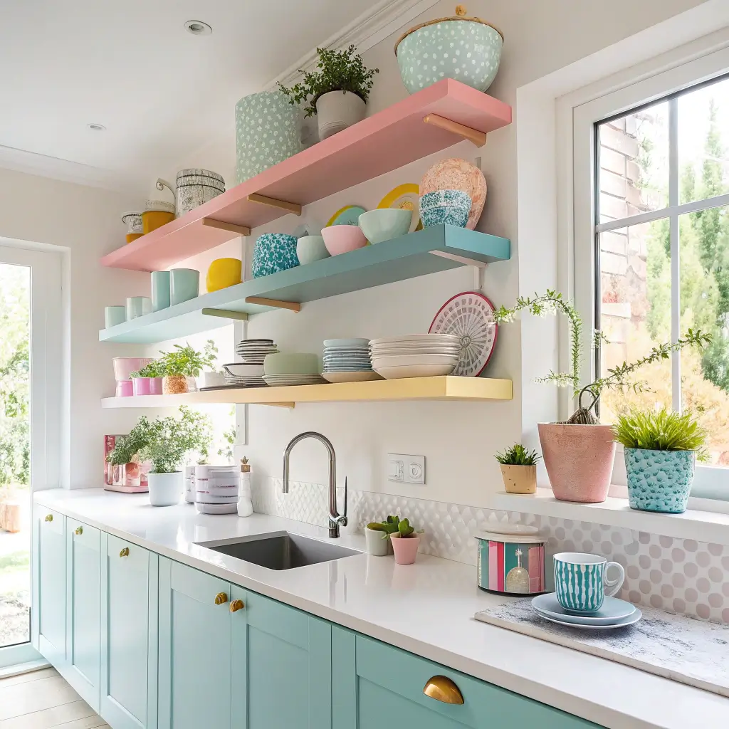 Colorful shelves are an easy way to add personality without committing to painting cabinets or walls.