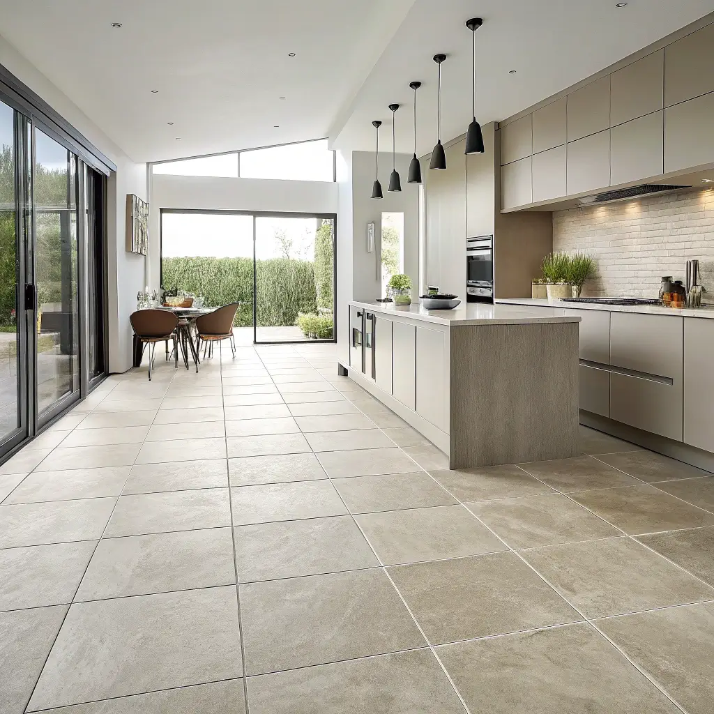Large-format tiles create expansive, seamless floors that make any kitchen feel bigger and more sophisticated. Fewer grout lines mean less scrubbing and a cleaner overall appearance.