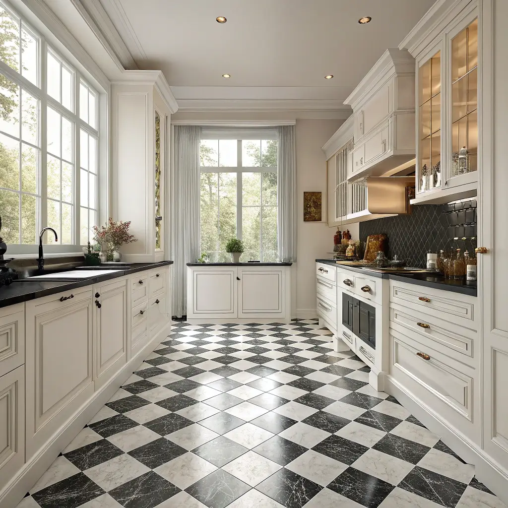 IMO, checkerboard floors are experiencing a major revival, but unlike trendy patterns, this one has proven staying power. I’ve seen them work beautifully in ultra-modern lofts and cozy farmhouse kitchens. The pattern adapts to whatever style surrounds it :/