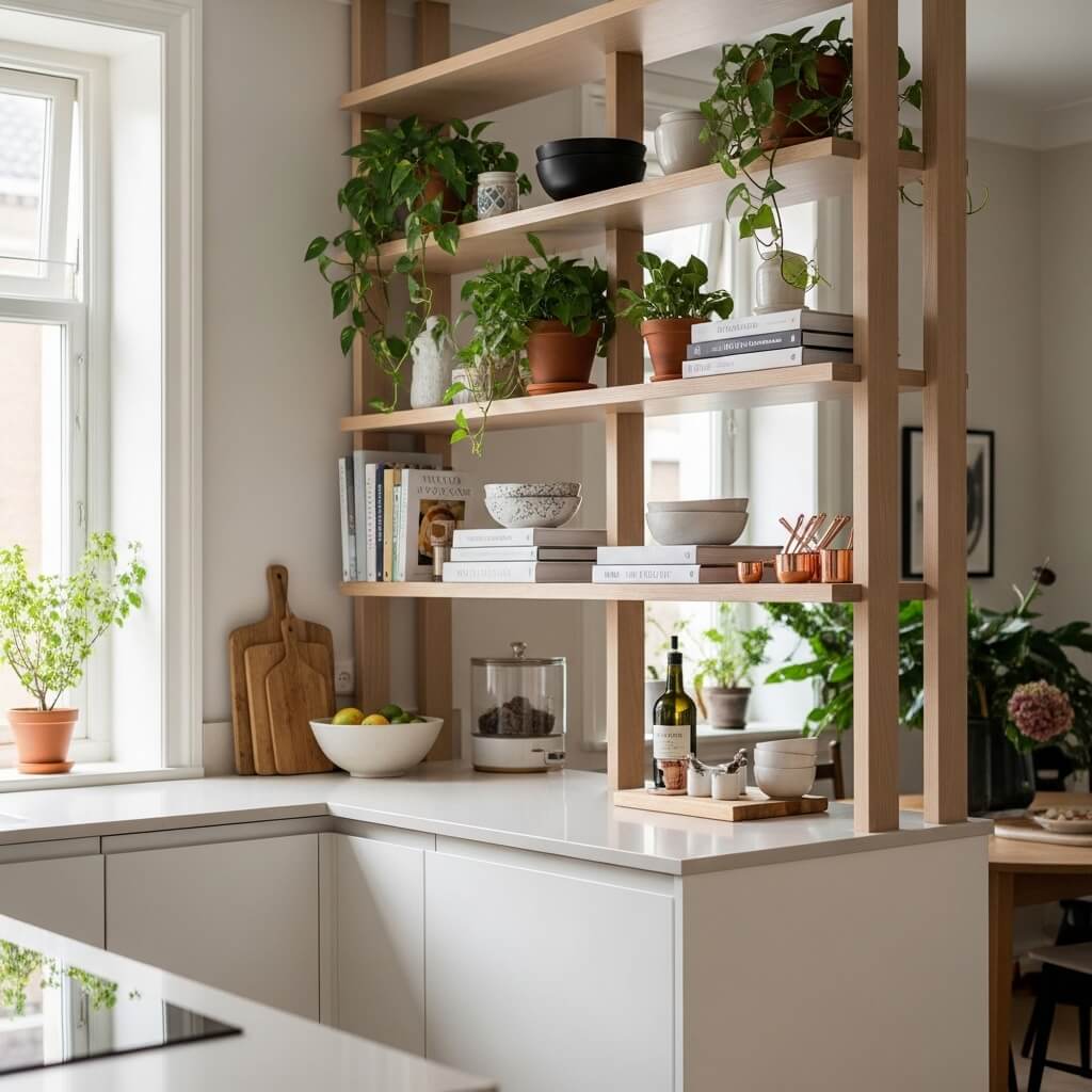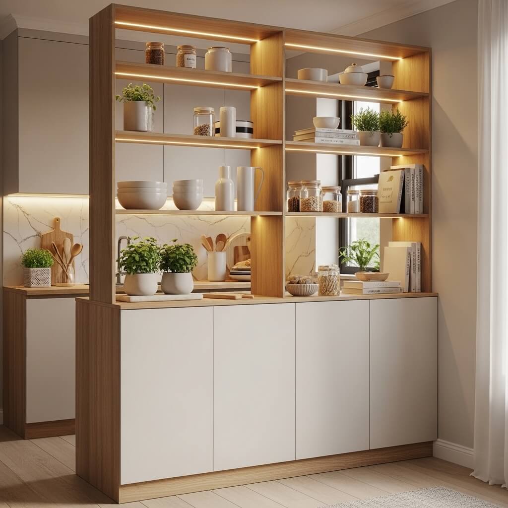 These partitions combine structural division with built-in cabinets, drawers, shelves, or cubbies. Imagine a floor-to-ceiling unit that faces your kitchen with deep cabinets for appliances and faces your living room with open shelving for books and decor. Both sides work hard, and the partition earns its footprint by being genuinely useful.