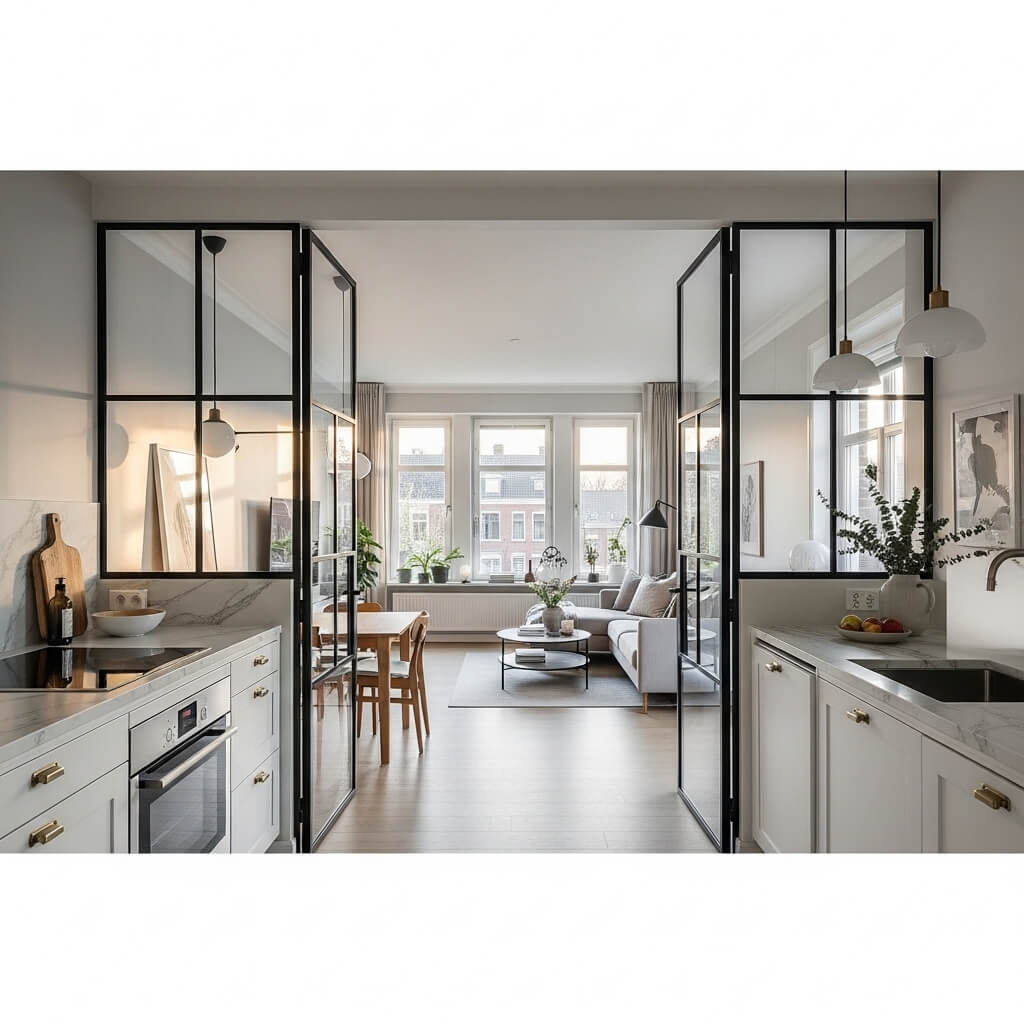 Installation tip: Get a professional to handle this one. Glass is heavy, and you want it mounted securely. The frame can be floor-to-ceiling or just a partial barrier, depending on how much separation you need. FYI, partial glass partitions work amazingly well if you still want some interaction between your kitchen and living area.