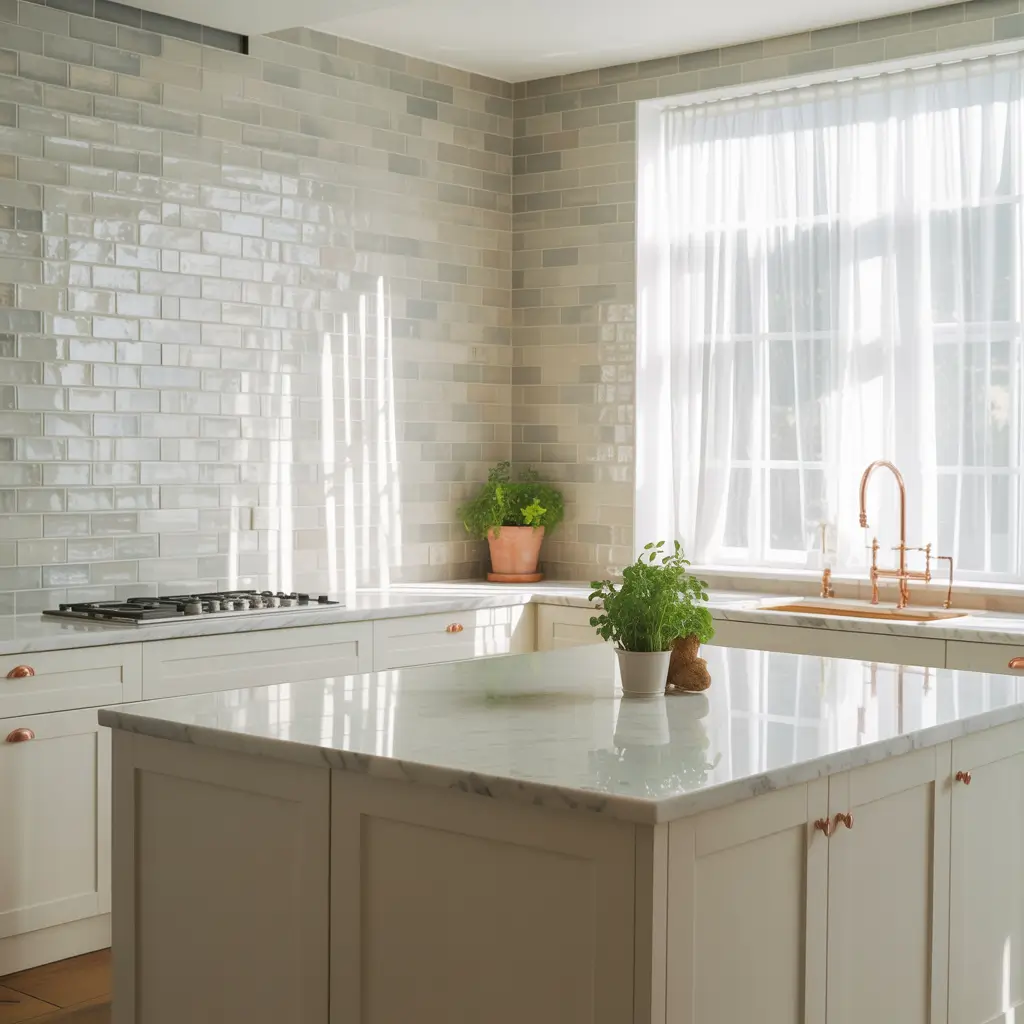 Metallic and shimmering kitchen tiles incorporate actual metal, metallic glazes, or iridescent finishes. These textures create light-catching surfaces with genuine sparkle.