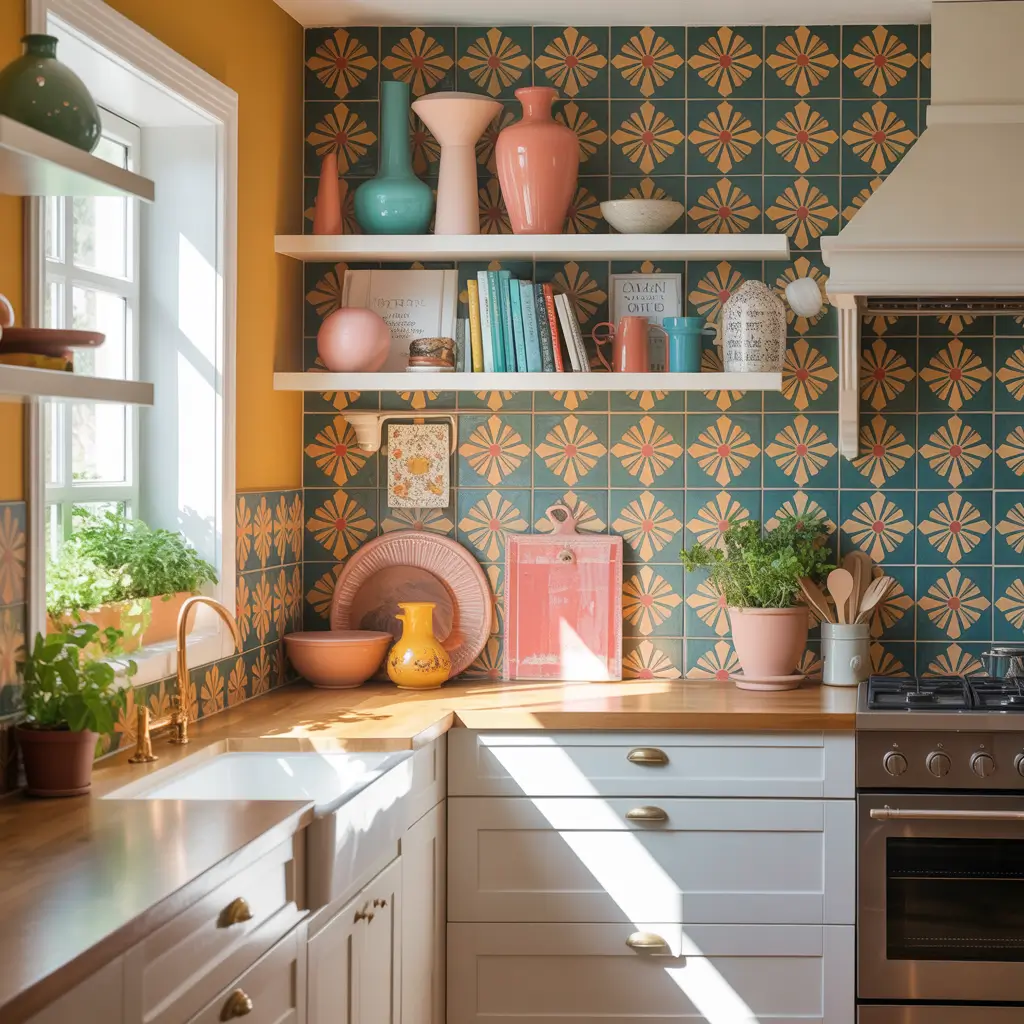 3D geometric kitchen tiles feature raised patterns creating actual dimension. These tiles transform flat walls into sculptural surfaces that change appearance throughout the day.
