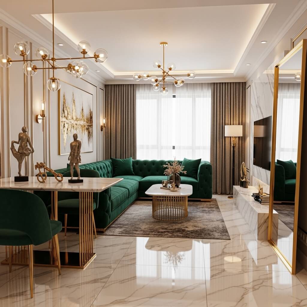 Alright, let’s talk about living that fancy life. If you’re going luxury, you might as well commit to the aesthetic fully, right? Pairing an L-shape sofa with marble elements creates instant sophistication that screams “I have excellent taste” without you actually having to scream anything.