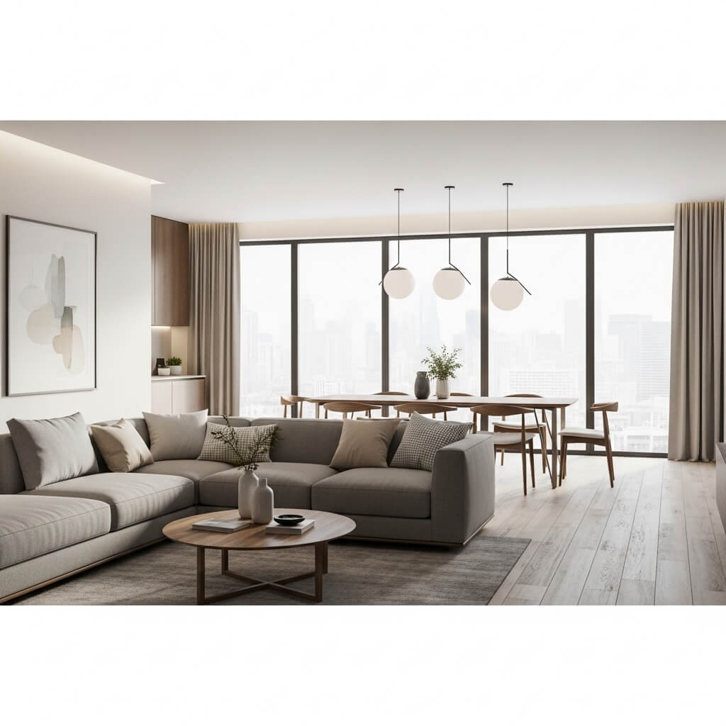 Float your L-shape sofa in the room—yes, pull it away from the walls—with the back facing your dining area. This creates a clear “living room” zone while maintaining visual openness. The back of the sofa becomes a subtle divider that doesn’t feel like a barrier.