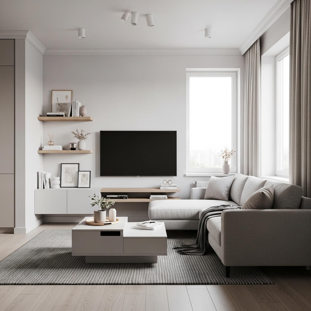 Position your L-shape sofa to define the living area without blocking natural light flow. In minimal designs, every piece needs to earn its place, so that coffee table should be functional, not just decorative. Add one statement piece—maybe a striking floor lamp or a single piece of abstract art—and call it done.