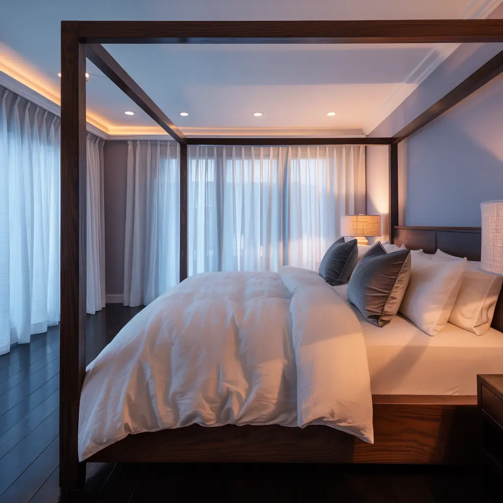 Okay, hear me out on this one. Canopy beds might seem extra, but in a large bedroom? They’re practically necessary. They create intimacy in a way that regular beds just can’t match.