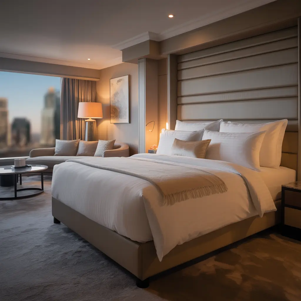 Start with bedding – hotels layer like pros. Fitted sheet, flat sheet, light blanket, duvet, throw blanket, plus more pillows than any human needs. The abundance is the point. Add a bench at the foot of your bed, pristine white towels in your seating area, and maybe even a tray with a water carafe on your nightstand.