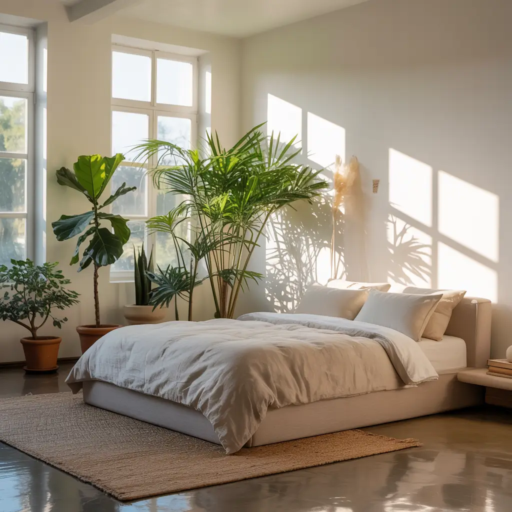 Don’t limit yourself to tiny succulents on the nightstand. Large bedrooms can handle substantial plants: fiddle leaf figs, bird of paradise, even small trees. Position them in corners, next to windows, or flanking furniture pieces.