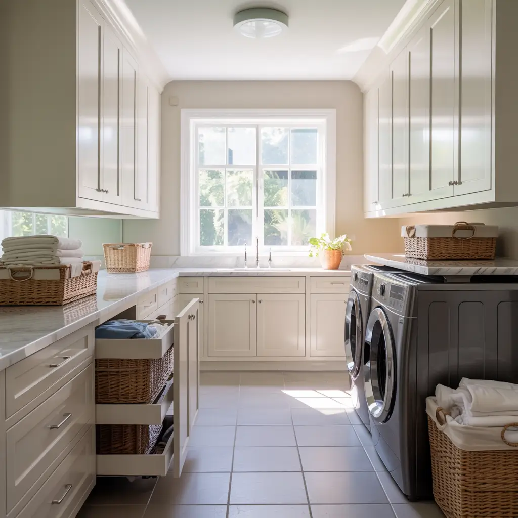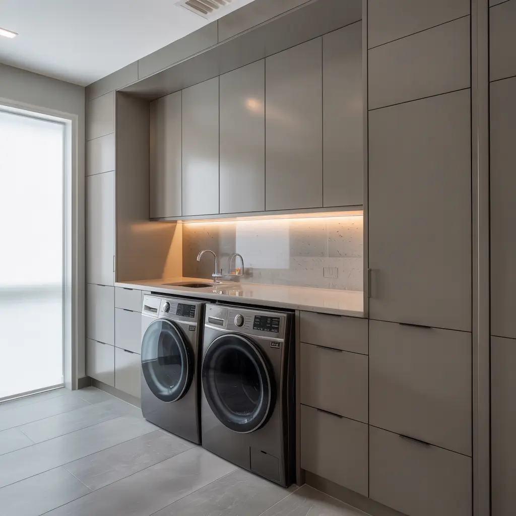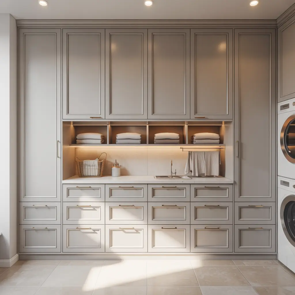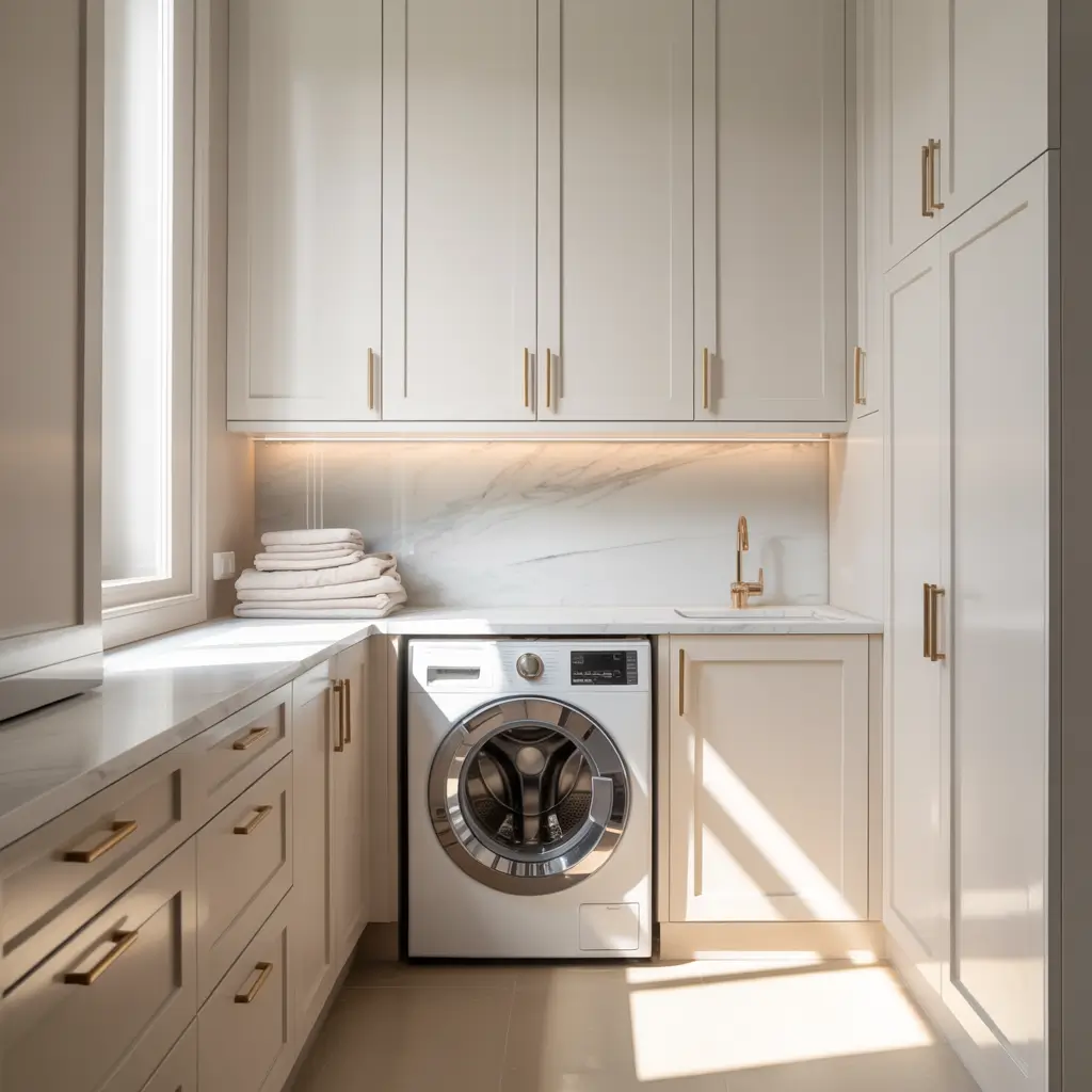 Sometimes less really is more. Minimalist white cabinets with gold hardware create this clean, sophisticated look that never goes out of style. It’s like the little black dress of laundry room design.